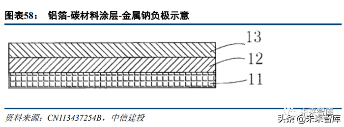 被授权于 2022 年的专利 CN113437254B 描述了在负极集流体表面涂覆碳材料-粘结剂层,以沉积金属钠负 极的方法。研究者认为,碳材料涂层能够有效降低钠金属沉积的过电势,抑制钠枝晶的形成,有利于提高电池 的循环性能。从实施例看,碳材料是炭黑、石墨烯、碳管复合物(其中含有少量氧),对应正极是聚磷酸铁钠, 电解液是 6F-DME(乙二醇二甲醚)。部分样品在 0.1C 倍率下的循环寿命超过 600 次公布于 2018 年的专利 WO2018014165A1 描述了以钠金属片进行补钠,提升钠离子电池容量保持率的方法。从实施例看,补钠后样品的循环寿命有明显提高。