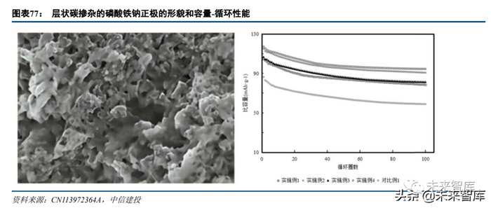 邦普公布于 2022 年的专利 CN113972364A 描述了层状碳掺杂磷酸铁钠正极材料的制备方法。研究者认为, 掺杂层状碳材料使得电池充放电时钠离子扩散距离短、传输速率更快,改善了钠离子脱嵌过程中的钠离子的相 位转变,提高了放电比容量,增强了磷酸铁钠晶体结构循环稳定性。从实施例看,研究者首先液相法制取磷酸 亚铁沉淀,其次以碳酸钠混合气态乙醛后高温热处理得到层状碳材料掺杂的碳酸钠,再将二者混合氢氧化镍、 助剂球磨洗涤干燥,高温反应,得到层状碳掺杂的磷酸铁钠。性能较好的实施例在 100 次循环后比容量约 100mAh/g。