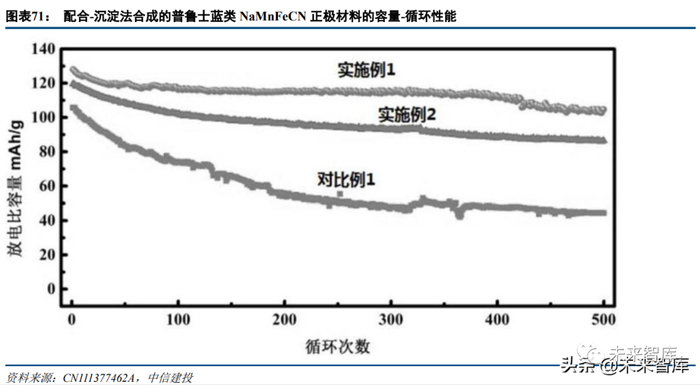 钠创新能源还研究了对 NaNiFeMn 氧化物进行体相掺杂(掺杂钾离子)、表面包覆(包覆二氧化铈、三氧化 二铝、氧化锌、五氧化二钒等)以提升综合性能的方法,分别见于专利 CN113889603A、CN113937262A、 CN112456567A。公布于 2020 年的专利 CN111377462A 描述了以乙二胺四乙酸钠-过渡金属、氰化钠溶液滴加抗坏血酸沉淀 成普鲁士蓝类正极材料的方法。研究者认为,相比于采用常规共沉淀方法,该方法可以通过控制弱酸溶液的浓 度和滴加的速度来控制结晶速度(过渡金属离子从稳定的配合物中释放出来,与亚铁氰化钠反应生成沉淀),有效降低材料中的晶体缺陷。另外,过渡金属类型和不同元素的含量对材料性能有较大影响。从实施例看,普鲁 士蓝类材料 Na1 .92Mn[Fe(CN)6]0 .98· 1.3H2O 的综合性能最佳。