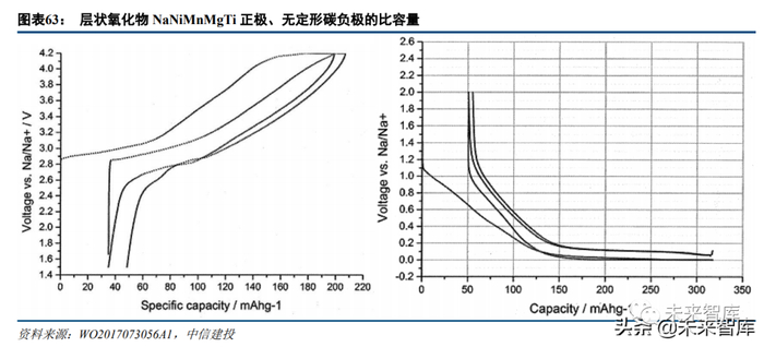 Faradion 公布于 2017 年的专利 WO2017073056A1 描述了采用层状氧化物 NaNiMnMgTi 正极(如NaNi0.33Mn0.33Mg0.167Ti0.167O2)-无定形碳负极的钠离子电池。研究者描述,该正极充电截止电压在 4-4.2V,首次 充电容量约200mAh/g,首次放电容量约160mAh/g;该负极首次充电容量约320mAh/g,首次放电容量约270mAh/g。