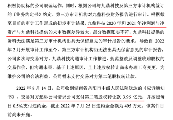 审计结果显示,九鼎科技2020年和2021年净利润、净资产与公司提供的未审数据差异较大,还存在部分数据账实不符问题。
