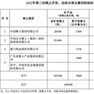 通知指出,2022年前两批合计稀土开采、冶炼分离总量控制指标分别为210000吨、202000吨,年度指标将综合考虑市场需求变化和稀土集团指标执行情况最终确定。记者查询发现,2021年度稀土开采、冶炼分离总量控制指标分别为168000吨、162000吨,这表明2022年前两批合计稀土开采、冶炼分离总量控制指标同比增幅均为25%。