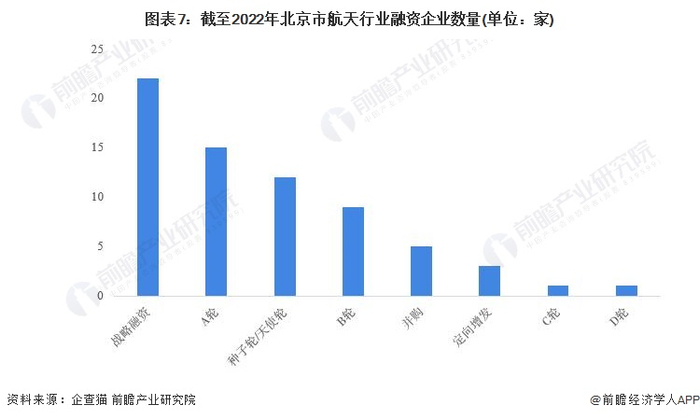 根据中国企业数据库企查猫,北京市共有近70家企业有融资信息,而其中以A轮和战略融资为主。截至2022年北京市航天企业中,有15家企业为A轮融资,22家企业为战略融资。