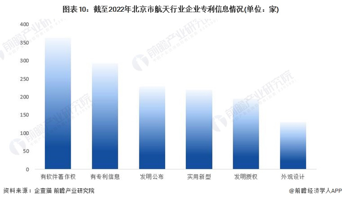 根据中国企业数据库企查猫,北京市航天企业中有近300家企业有专利信息,超350家企业有软件著作权。在专利信息中,航天企业以发明为主,拥有发明信息的企业有超200家。