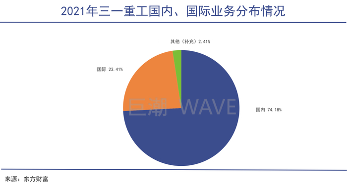 2021年,三一重工声称国际化取得积极进展,实现国际销售收入248.46亿元,同比增长76.16%,国际收入占营业收入比重同比上升9.2个百分点,但也仅占营收总额的23.41%。