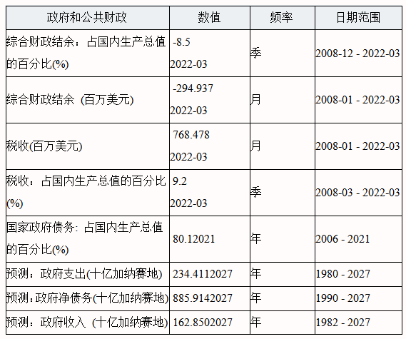 2021年12月,加纳政府债务占该国名义国内生产总值的80.1%,而上一年为76.1%,详见下表。