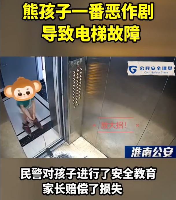 安徽淮南,“熊孩子”玩坏电梯后,家长赔偿了1200元。