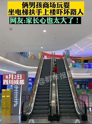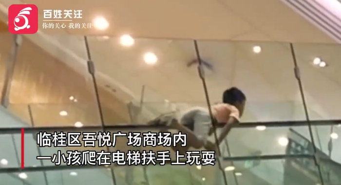还有孤身趴扶手的:8月4日,广西桂林,一男孩趴在扶梯上悠然上行,“爬”到头后,才被飞奔赶来的路人劝下来。
