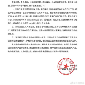 8月18日,名创优品再次通过官方微博发布致歉声明称,就其曾以“日本设计师品牌”自居的营销行为而道歉,并将于2023年3月前完成“去日化”整改。“名创优品自始至终是一家中国企业,要做堂堂正正的中国品牌。”声明称。