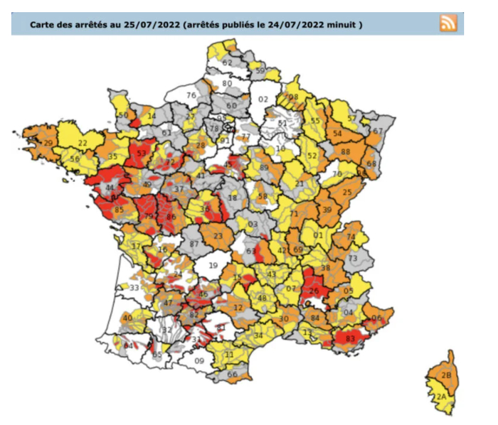 目前,有28个省被列为“危机”——警报级别最高,Centre-Val de Loire和Pays de la Loire地区似乎受到的影响最为严重,如下图所示。