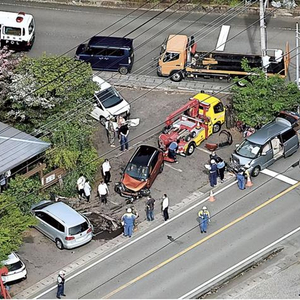 阿尔科尼斯驾驶的灰色面包车(右)2021年5月冲入富士宫市一餐饮店停车场,致2人死亡1人受伤,图自日媒