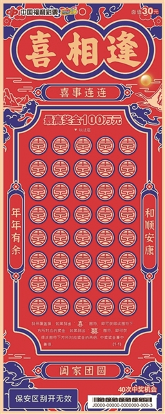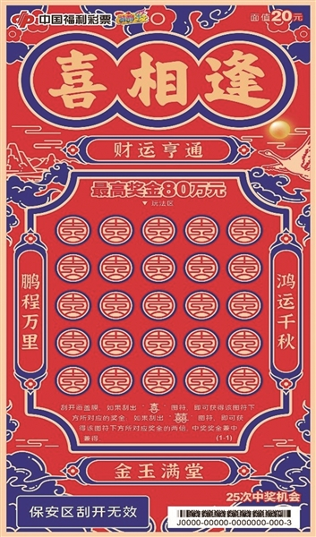 近日,一款名为“喜相逢”的福彩刮刮乐新游戏在全国精彩上市。票如其名,欢乐喜庆,寓意美好。