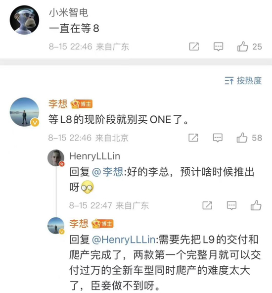 8月15日,理想汽车CEO李想在微博回复网友评论,“等L8的现阶段就别买ONE了”。李想还非常凡尔赛地补充道,“需要先把L9的交付和爬产完成了,两款第一个完整月就可以交付过万的全新车型同时爬产的难度太大了。”言下之意是,理想L8首个完整交付月即可实现交付过万。