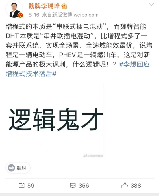 8月16日,李瑞峰发微博称,“增程式的本质是‘串联式插电混动’,而魏牌智能DHT本质是“串并联插电混动”,比增程式多了一套并联系统,实现全场景、全速域能效最优,说增程是一辆电动车,PHEV是一辆燃油车,这是对新能源产品的极大讽刺,什么逻辑呢!?”
