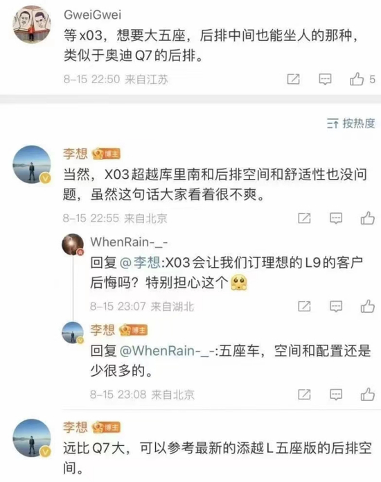 对于另一款新车“理想X03”,李想也延续了L9的营销老套路。“X03超越库里南后排空间和舒适性也没问题,虽然这句话大家看着很不爽。”他还表示,“X03后排空间远比Q7大,可以参考最新的添越L五座版的后排空间。”