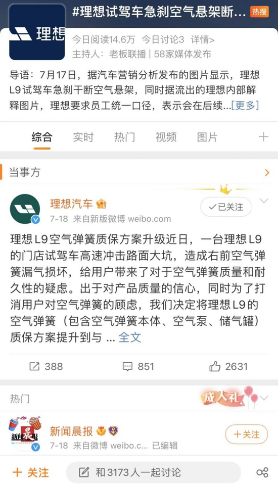 7月17日,一辆理想L9在试驾时,疑似发生空气悬挂断裂。当天,“理想试驾车急刹空气悬架断裂”的微博话题冲上热搜。