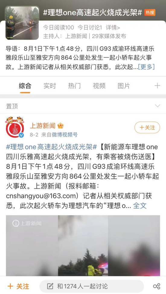 8月2日,“理想ONE高速起火烧成光架”的微博话题迅速登上热搜榜。此前一天,一辆理想ONE在四川省成渝高速起火,四人烧伤并快速离开车辆。