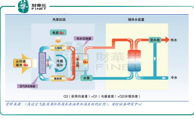 据悉,空气能热泵是利用逆卡诺循环原理,仅依靠少量电能驱动压缩机,有效利用空气热能这一可再生能源,可替代燃气等能源制热,节能效果显著,运行中可以做到零污染,广泛运用于家用和商用热水、采暖、烘干等领域。