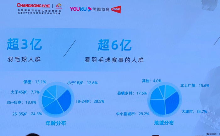 据悉,中国超6亿人或多或少地和羽毛球这项运动发生了联系,真正参与到羽毛球运动之中的有3亿人。我们此前一直在做各式各样所谓的大球项目的运动,无论是篮球还是足球,男女的比例是严重失调的,基本上是2比8,最多是3比7,男性用户占到绝大多数,但是羽毛球是6比4或者说是5.5比4.5,羽毛球是一项男女通吃的运动项目。