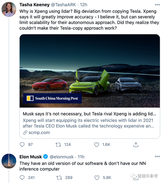 2020年11月21日,广州车展,何小鹏推出了新一代P7,并发布了包含激光雷达的下一代自动驾驶架构。随后,马斯克发推:“他们有我们旧版本的软件系统,但缺特斯拉新一代推理处理器。”暗指小鹏抄袭。