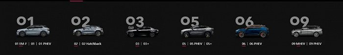 除了各种尺寸的轿车、SUV和MPV外,动力模式还分了燃油、HEV、PHEV、BEV以及醇电混动和甲醇汽车,其中混动又包含两代思路不同的系统ePro(P2.5单电机+7DCTH)和雷神智擎Hi·X(双电机+行星齿轮组),前者为定轴式机电耦合系统,后者为行星齿轮式机电耦合系统。