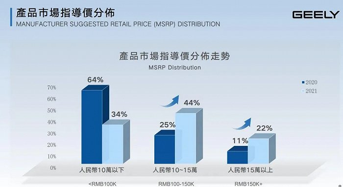 与多数传统车企相似,吉利也在通过不同的产品组合拉高整体售价。根据2021年年报数据,其产品市场指导价主要区间已经由2020年的10万元以下,转移至10-15万元。
