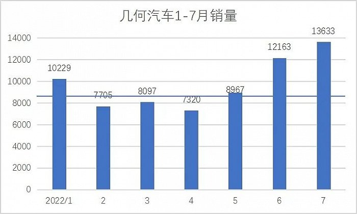 BEV迅速增长的原因主要来自几个方面,一是几何汽车从去年到今年有多辆改款/新款车型上市,目前已有几何A Pro、几何C、几何E、EX3功夫牛四辆产品在售,虽然与其兄弟产品帝豪、远景有着千丝万缕的关系,但也架不住品牌整体售价较低,1-7月中也有三个月销量破万。