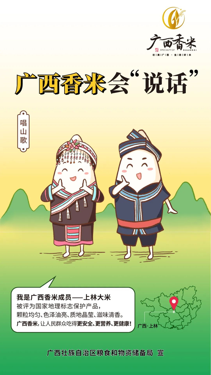 广西壮族自治区粮食和物资储备局以广西香米为主题,选取古辣香米、东津细米、上林大米、象州优质米等作为广西香米典型代表,精心设计公益海报,融入当地风土人情,采用手绘画形式,创作拟人卡通形象,讲述广西香米特点和地域民族文化。