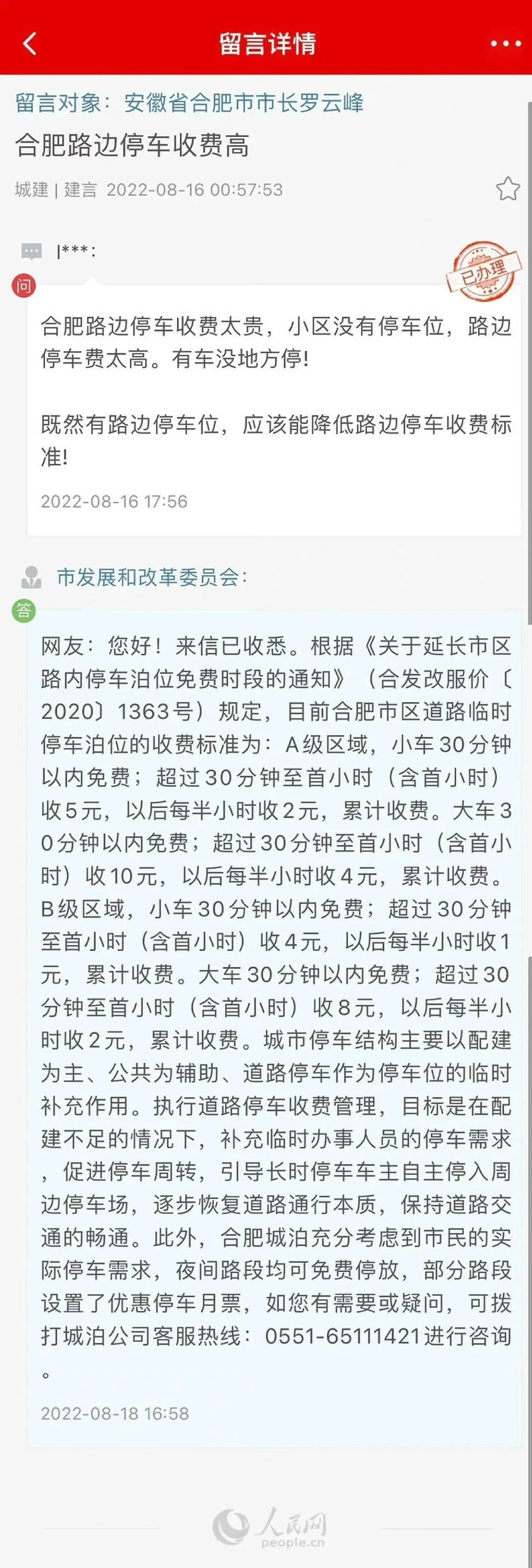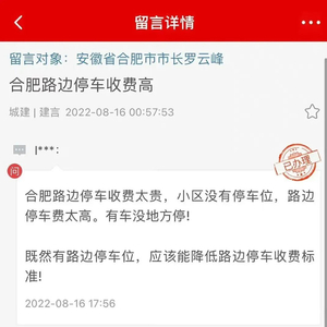 日前,有网友在人民网领导留言板留言:合肥路边停车收费太贵,小区没有停车位,路边停车费太高。有车没地方停,既然有路边停车位,应该能降低路边停车收费标准。