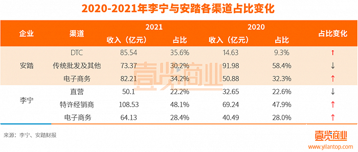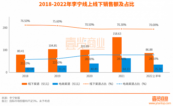 李宁最新的财报显示,上半年李宁营收124.09亿元,同比上升21.67%。其中特许经销商销售59.01亿元,占比47.5%,同比增加2.5%;直营销售27.85亿元,占比22.5%,同比减少2.2%。电商渠道销售35.34亿元,占比28.5%,同比减少0.6%(另国际市场销售部分占比1.5%)。