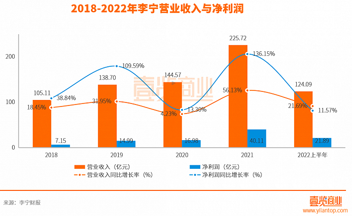 除了渠道,盈利能力也成为困扰李宁的新问题。半年报显示,今年上半年李宁的净利润21.89亿元,同比上升11.57%,与去年同期的187.18%相比,增速下降了175.61%。除了两次国潮红利给李宁带来的短暂辉煌,从2018年到2022年,李宁净利润同比增长的速度其实是一直在下降的。