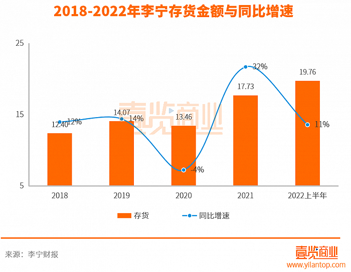 一方面,存货困局。2021年,李宁存货金额17.73亿元,同比上涨4.27亿元,增长32%;2022上半年,存货金额19.76亿元,同比上涨2.03亿元,同比增长11%。除了2020年出现过微弱的下降幅度,李宁的存货金额几乎是处于一个缓步上升的趋势。