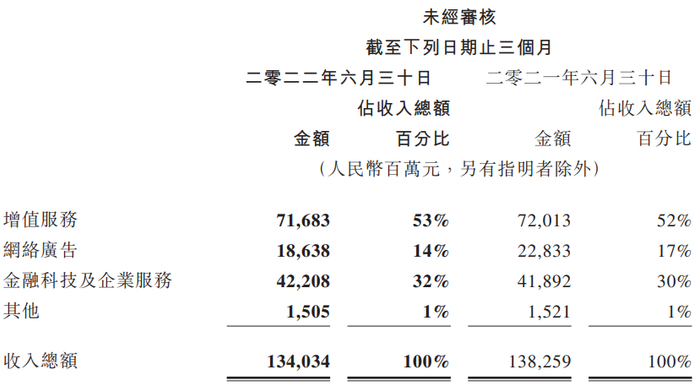 如果我们再仔细拆解腾讯控股各个收入分部的表现,会发现其比整体业绩显示的更为乐观。目前,腾讯控股从收入构成上主要分为增值服务、网络广告、金融科技及企业服务三部分。
