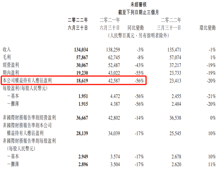 不过笔者在阅读有关腾讯财报的信息时,注意到其在第二季度的营收为1340.34亿元,同比去年下跌只有3%;毛利为578.67亿元,同比去年下跌只有8%,另外腾讯控股在二季度执行了较大力度的成本控制与费用节约计划,按正常逻辑其净利润大跌56%并不合乎情理,于是笔者下载并详细阅读了腾讯控股完整的财务报告。