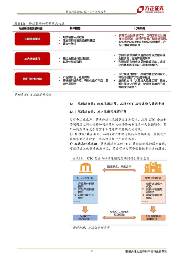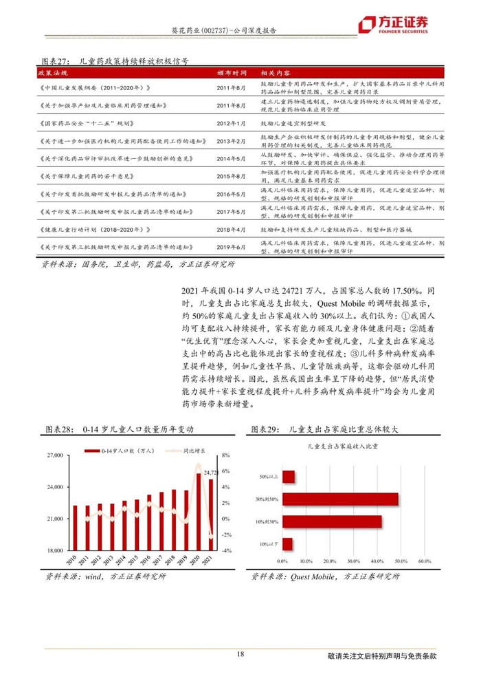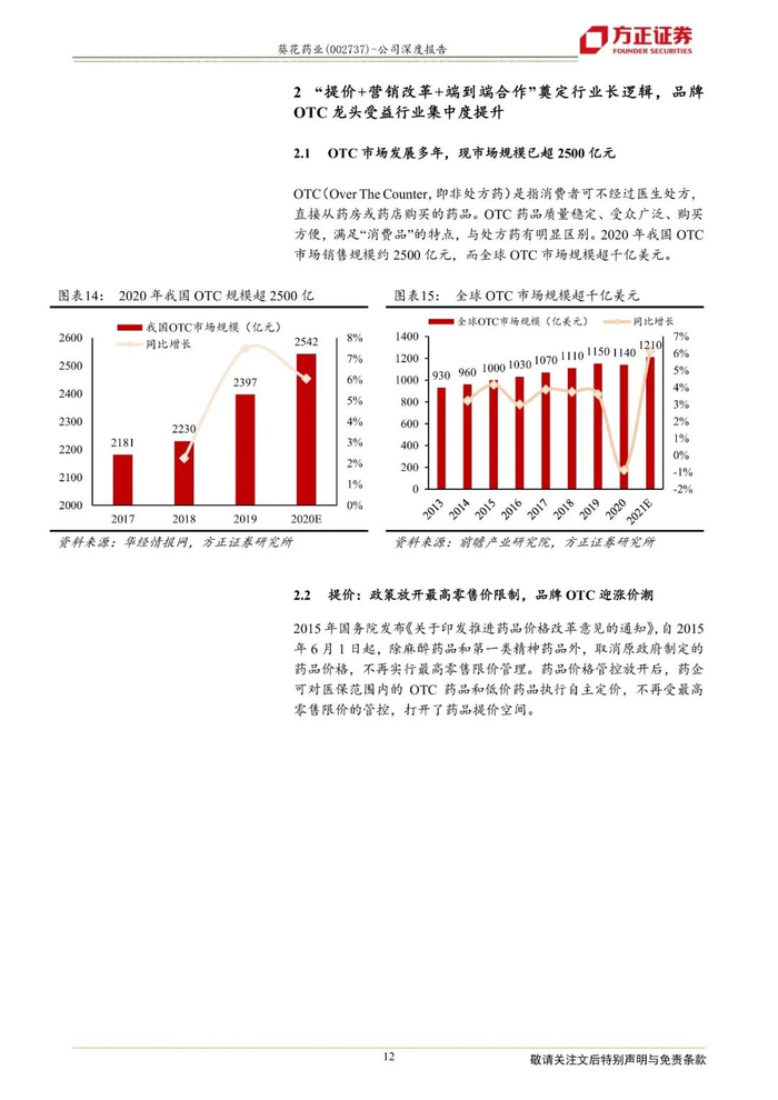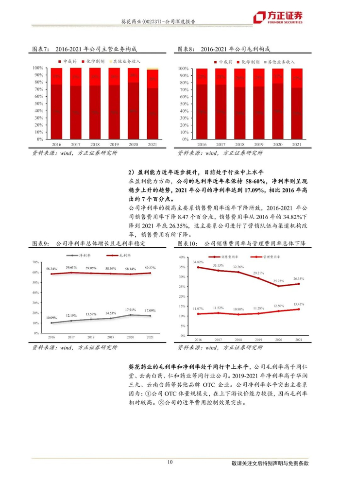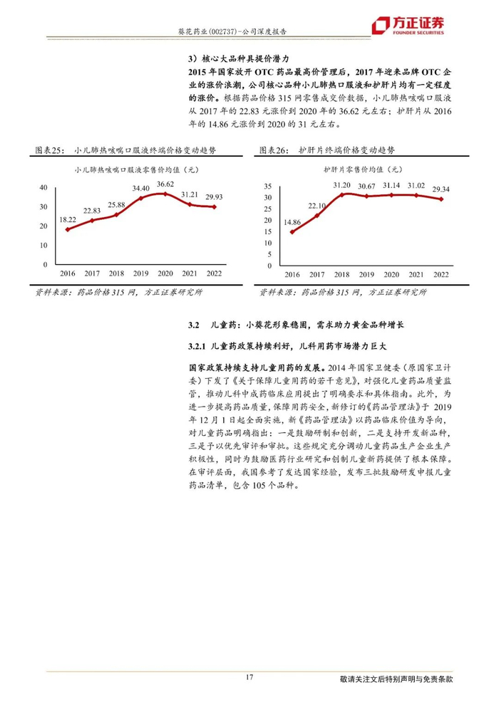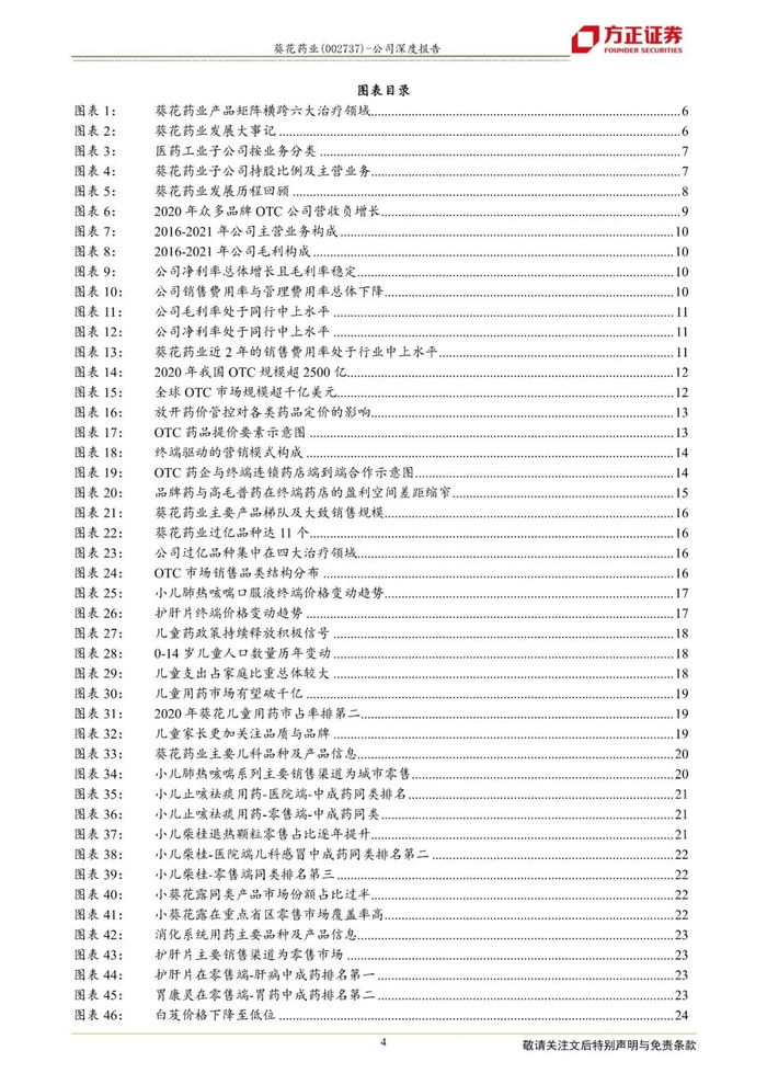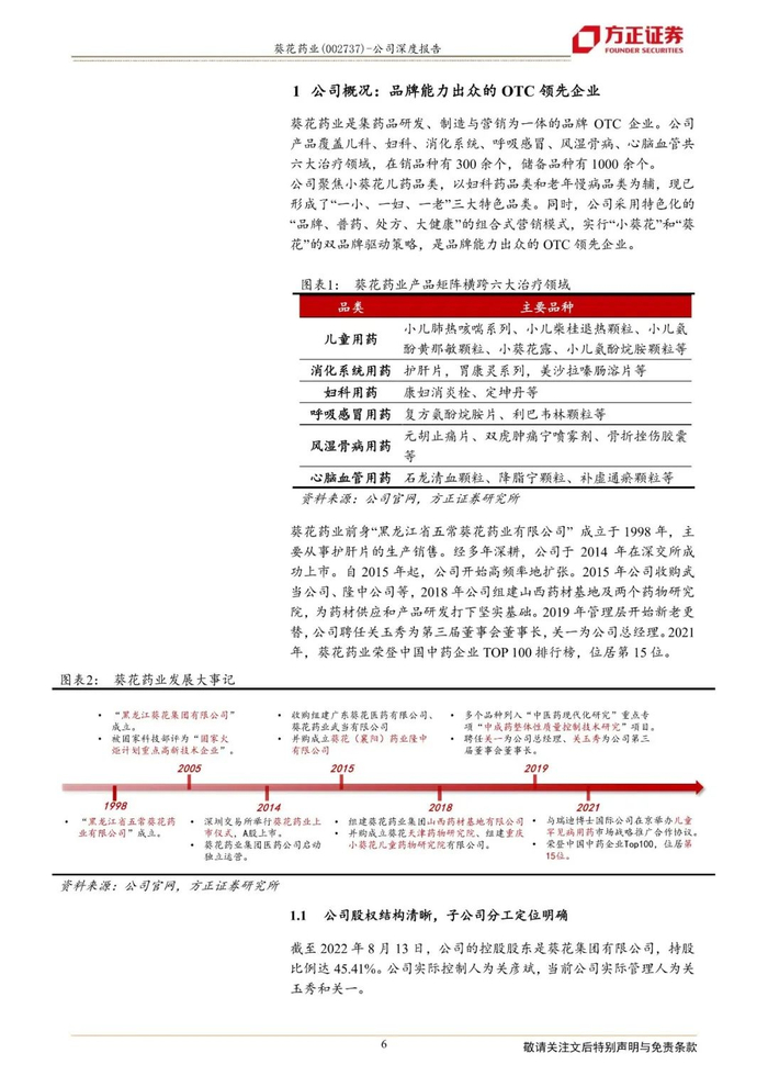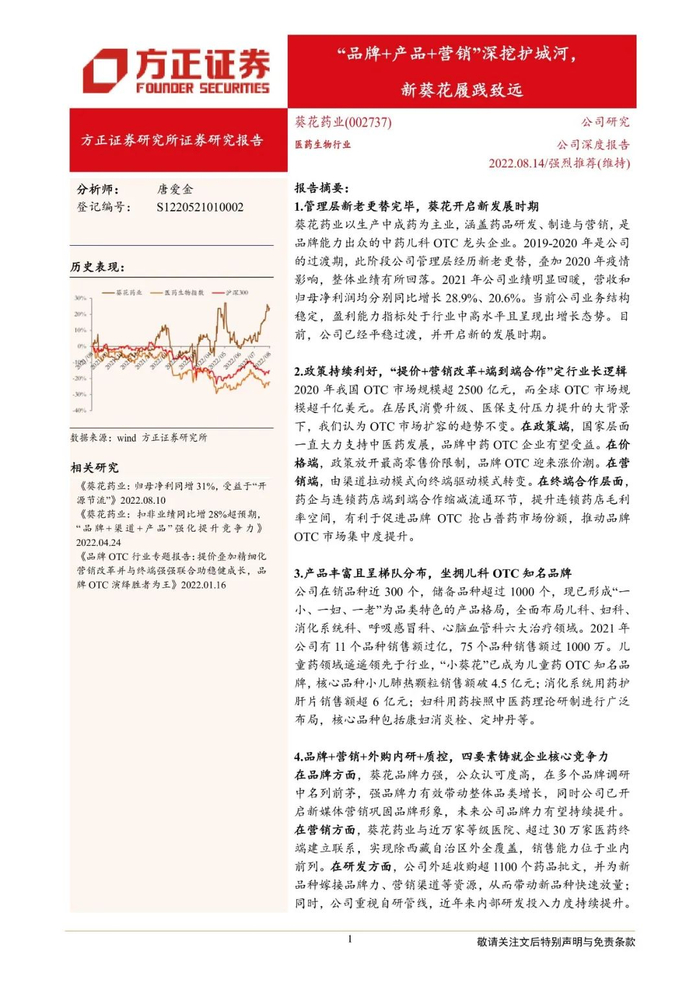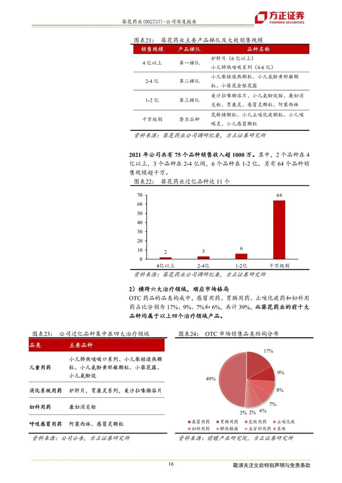 2、政策持续利好,“提价+营销改革+端到端合作”定行业长逻辑:①在政策端,国家层面一直大力支持中医药发展,品牌中药OTC企业有望受益。②在价格端,政策放开最高零售价限制,品牌OTC迎来涨价潮。③在营销端,由渠道拉动模式向终端驱动模式转变。④在终端合作层面,药企与连锁药店端到端合作缩减流通环节,提升连锁药店毛利率空间,有利于促进品牌OTC抢占普药市场份额,推动品牌OTC市场集中度提升。3、产品丰富且呈梯队分布,坐拥儿科OTC知名品牌:①公司在销品种近300个,储备品种超过1000个,现已形成“一小、一妇、一老”为品类特色的产品格局。②儿童药领域遥遥领先于行业,“小葵花”已成为儿童药OTC知名品牌,核心品种小儿肺热颗粒销售额破4.5亿元。③消化系统用药护肝片销售额超6亿元。④妇科用药按照中医药理论研制进行广泛布局,核心品种包括康妇消炎栓、定坤丹等。4、品牌+营销+外购内研+质控,四要素铸就企业核心竞争力:①在品牌方面,葵花品牌力强,公众认可度高。②在营销方面,葵花药业与近万家等级医院、超过30万家医药终端建立联系。③在研发方面,公司外延收购超1100个药品批文,并为新品种嫁接品牌力、营销渠道等资源,从而带动新品种快速放量。④在质控方面,公司持续推行“打造精品药”战略,提出“打造精品药十步法”,保证药品高品质。5、盈利预测:我们测算公司2022-2024年实现营收分别为50.5亿元、58.14亿元、66.97亿元,分别同比增长13.21%、15.13%、15.19%。预计2022-2024年归母净利润为8.62亿元、9.98亿元、11.81亿元,分别同比增长22.31%、15.77%、18.34%,对应当前股价PE分别为13倍、11倍、9倍。维持“强烈推荐”评级。风险提示:疫情持续影响;销售不达预期;药品安全风险;研发不及预期风险;新品推出不及预期风险。
