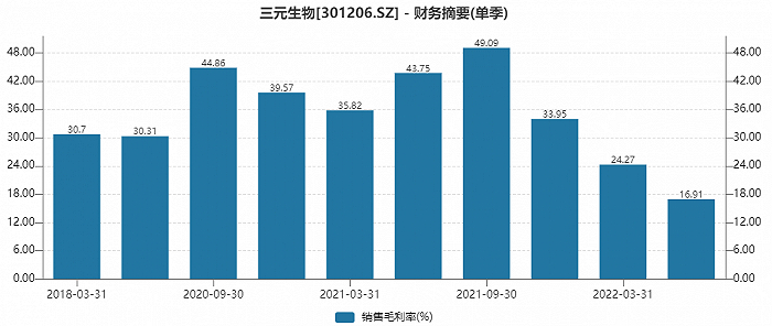从三元生物毛利率变化也可以看到,最高点49.09%出现在2021年第三季度。三元生物上市时间是2022年1月,披露的财务数据正好截止到2021年第三季度,完美诠释了“上市即巅峰”。随后,公司毛利率伴随着赤藓糖醇一路下降,到2022年第二季度仅剩16.91%。