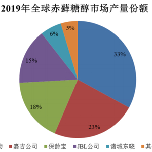 沙利文研究数据显示,在2019年全球赤藓糖醇生产企业产量份额中,三元生物市场份额最大为33%,美国嘉吉公司为23%,保龄宝为18%,瑞士JBL公司为15%,这四家公司占据近90%的市场份额。
