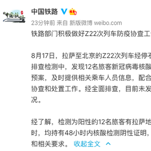 8月17日,拉萨至北京的Z22次列车经停石家庄北站,在下车乘客“落地检”及后续排查检测中,发现12名旅客新冠病毒核酸结果阳性。铁路部门第一时间启动应急预案,及时提供相关乘车人员信息,配合沿途各站所在地卫生防疫部门开展流调协查和处置工作。经全面排查,目前未发现同车其他旅客和铁路工作人员感染情况。