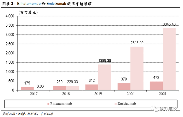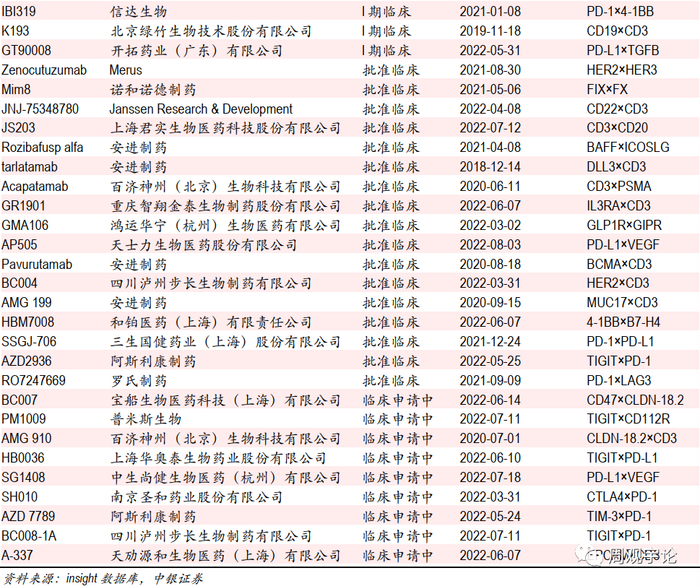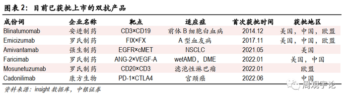 这两年间获批了较多的双抗,包括强生公司在2021年5月获批的EGFR×cMet双抗Amivantamab,罗氏子公司Genentech公司在2022年1月获批的Ang-2×VEGF-A双抗Faricimab,罗氏公司在2022年6月在欧盟获批上市的CD20×CD3双抗Mosunetuzumab。2022年6月29日,康方生物的PD-1×CTLA-4双抗卡度尼利在我国附条件获批上市用于治疗宫颈癌患者,也是全球首个基于双免疫检查点的双抗。尽管目前获批的产品不多,双抗产品Emicizumab已在上市的5年间成为年销售额33亿美元的全球重磅药物。