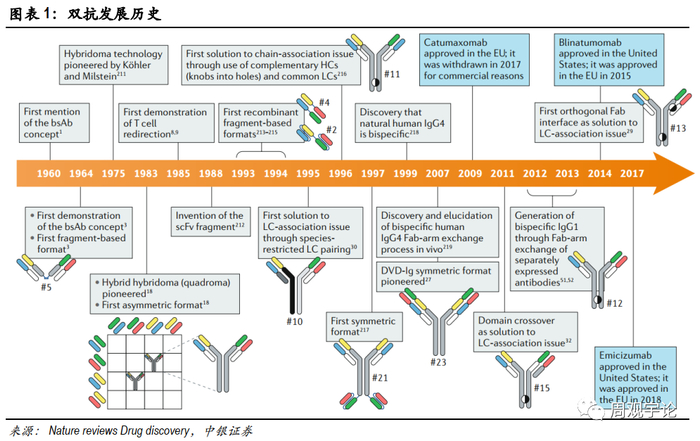 双抗这个概念在1960年首次提出,1975年杂交瘤技术的发明使得双抗的生产成为可能,1983年Milstein等人首次使用杂交瘤技术生产出非对称结构的双抗。1996年,首个解决链间错配问题的技术Knob-into-holes问世,大大提高双抗生产的成功率。2009年,首个双抗catumaxomab在欧洲获批治疗恶性腹水(在2017年由于商业原因撤回),2014年CD19 X CD3 双抗Blinatumomab被FDA批准用于治疗急性淋巴白血病,其临床结果显著优于化疗组。2017年11月,Emicizumab被批准用于治疗A型血友病,双抗药物首次进入非癌症领域发挥作用。