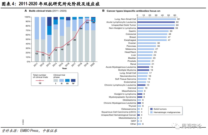 自双抗首个产品上市,概念得到验证后,越来越多的双抗投入研究,双抗相关的临床试验数量以每年20.44%的速度持续增长。根据国家肿瘤临床医学研究中心在2021年发表在EMBO的文章统计,实体瘤相关临床试验占到55.2%,血液瘤则是44.8%,文章发表时,93.5%的临床试验仍处于临床I期和II期。