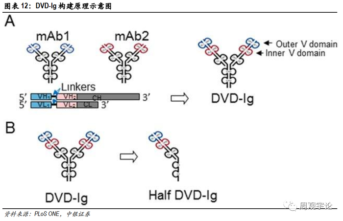 全称Dual variable domain immunoglobulin,是一种对称的双抗分子设计,拥有4个抗原结合位点。其特征是用短肽做linker连接两个可变区,由于采用的对称式的结构设计,因此不存在的常见双抗错配问题。目前采用DVD-Ig平台设计的抗体是ABT122和ABT165,前者靶点是IL-7×TNF-α,主要治疗类风湿关节炎患者;后者靶点为DLL4×VEGF,主要适应症为癌症。
