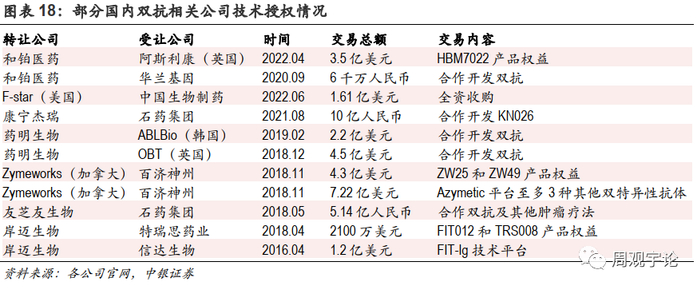 尽管国内商业化的双抗产品目前仅有康方生物的AK104,中国企业所开发的双抗技术平台其竞争力和市场潜力已经得到认可, 近几年除了和国内公司合作,和铂医药和药明生物等公司也成功把其优秀技术推向海外,达成了数笔上亿美元的交易。