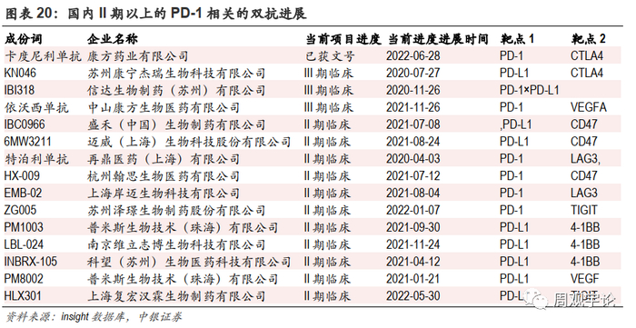 规模较大的制药公司可以通过同时布局几个靶点,带动各自产品的销售额。如果没有PD-1产品,在推进联用方案时,必然要引入其他药企的产品或者是达成相关合作,带来的结果是不仅需要付出大量临床试验的成本,而且也会导致联用方案不确定性过高,治疗成本难以控制,整体治疗费用偏高而失去市场竞争力。对于大多数处于成长期的Biotech公司而言,研发PD-1相关双抗收益可能是更优的选择,甚至可以实现“弯道超车”。