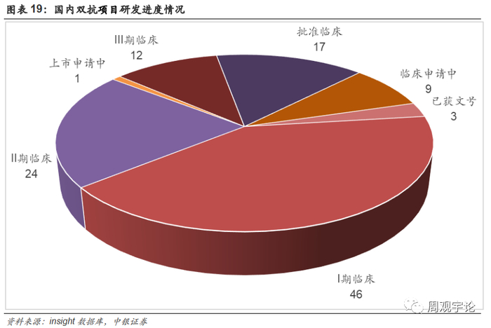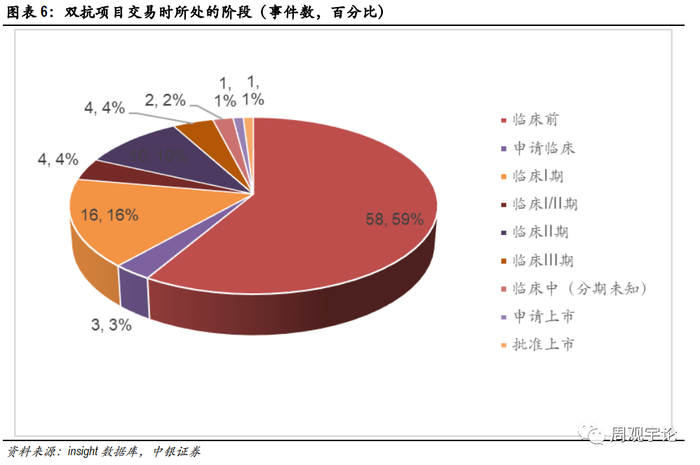 双抗产品交易时多处于临床早期阶段,技术重要性显现。根据统计,多数双抗项目交易时处于较为早期的阶段。如下图所示,78%的项目在交易时仍处于临床I期甚至更早的状态,59%的项目在交易时处于临床前阶段。国际知名制药公司如安进、艾伯维、强生也都出手购买过多个双抗产品。这很大程度上表明尽管在双抗的临床有效性还具有一定不确定性的情况下,双抗相关的技术平台重要性已经得到多方肯定,企业更偏向于早期布局。