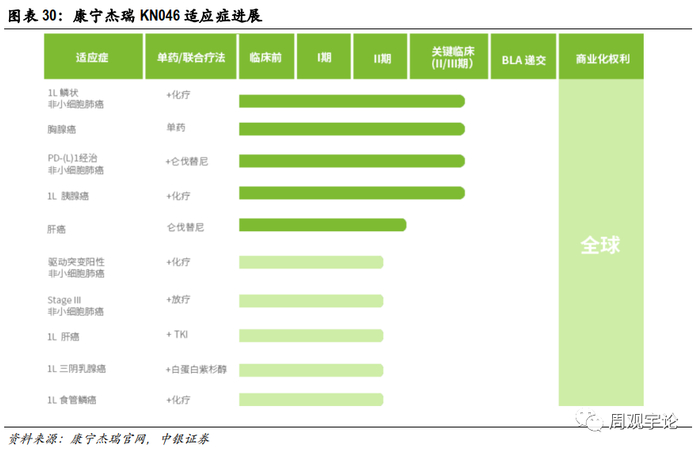 KN046:KN046是康宁杰瑞自主研发的PD-L1×CTLA-4双特异性抗体,其创新设计包括:采用机制不同的CTLA-4与PD-L1单域抗体融合组成,可靶向富集于PD-L1高表达的肿瘤微环境及清除抑制肿瘤免疫的Treg。