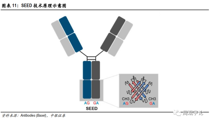 SEED技术在2010年发明,也是为了解决重链同源二聚化的问题。其原理是采用IgA和IgG的部分序列,对重链的CH3区采用了重新设计,重构之后,两段重链所对应的区域呈现出互补结构,根据James等人2010年发表在Protein Engineering上的文章,形成异源二聚体的成功率进一步提高到85-95%。同时,因为SEED技术在Fc区进行编辑,保留了完整的Fc结构,抗体的免疫识别效应得以完整保留。
