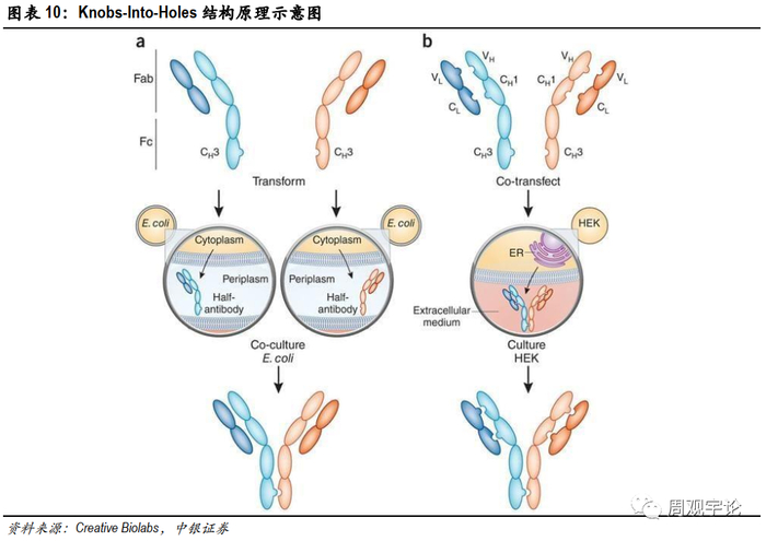 丰富的双抗技术平台突破双抗生产主要难点,重要性凸显。双抗结构上由2条不同重链和2条不同轻链构成,链间自由组合不仅生成多种错误结构的副产物,造成产率低,同时也提高了下游分离纯化的难度。后续发展出来以Knobs-Into-Holes为主的一系列各具特色的技术手段,通过不同路径解决链间错配问题,显著提高了生产的成功率,极大推动了双抗产品的开发。
