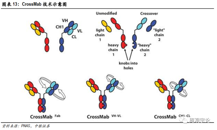 Crossmab是罗氏开发的,是旨在解决轻链错配的一类技术。Crossmab技术在2011年被发明,一般会和之前提到的Knobs-Into-Holes技术结合使用,方法是把一条重链和一条轻链的Fab片段进行交换,具体实现方式有3种。(1)CrossMabFab:整个Fab区交换;(2)CrossMab VH-VL:把重链的VH和轻链的VL进行交换;(3)CrossMab CH1-CL:把重链的CH1和轻链的CL进行交换。罗氏凭借这项技术,开发了多种双抗,其中约有19种双抗已经进入临床期,16种双抗处于临床前研究阶段。
