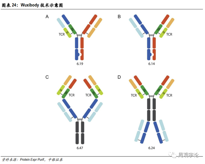 Wuxibody是药明生物在2019年开发,属于全长双抗的一个分类,可以做成2价或者4价双抗,其技术原理是用T细胞受体(TCR)的恒定区α和β区分别替换到轻链的CL区和重链的CH1区。药明生物官网称该技术的优势在于可以有效降低生产成本,半衰期提高到两周以上等。药明生物已与多家公司达成合作,包括天境生物、正大天晴、Oxford BioTherapeutics、ABL Bio等多家公司。在2018年12月,Oxford BioTherapeutics向药明生物支付了高达4.5亿美元的价格,获得了WuXiBody平台的物种双抗开发和商业化权益;在2019年2月,韩国ABL Bio公司向药明生物支付了2.2亿美元,获得研究、开发和商业化双抗的权益。